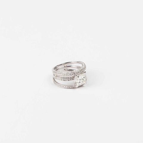 Bague en or gris, trois anneaux sertis de deux diamants avec au centre un diamant de 2,5 carats
